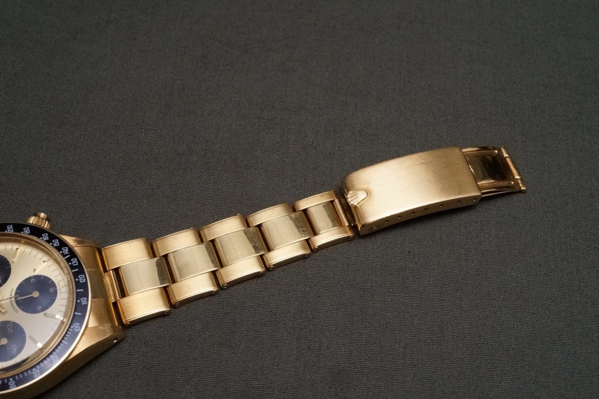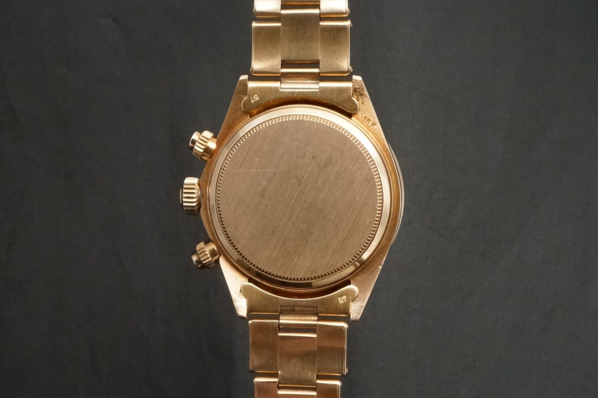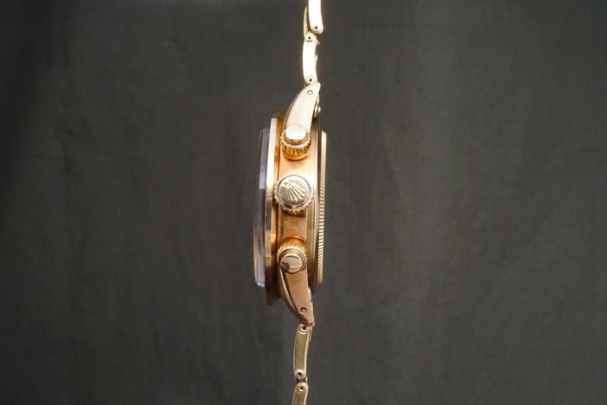 ロレックススポーツにおける最高峰ラインの金無垢デイトナ6263/8のシャンパンダイアルが入荷しました。ダイアルは目立つ荒れや傷等のない、全体を通してとても綺麗で、インダイアルの汚れも見当たらない美しい状態です。また針夜光も含めオールトリチウムです。欠け易いダイアルのドット夜光は一部に変形がありますが、欠け等もなく色味も変色もなくかなり良い状態を保っています。ケースはやわらかい金無垢モデルにありがちな過度の研磨や大きな傷など無く、オリジナルフォルムを残した良好なコンディションを維持しております。数の少ない金無垢モデルでは特に重要なパーツであるプッシャーも当時の溝無しマーク2プッシャーがしっかりと残っています。マーク2ベゼルも全体を通してとても綺麗な状態です。リベットブレスは軽い伸びや小傷はありますが概ね良好な状態です。機械は全巻きの3姿勢時で日差20秒以内に収まる良好な状態です。ゴージャスなゴールドスポーツモデルの中でも間違いなく満足度では群を抜いている存在がこの金無垢デイトナです。ひと昔前のシャンパン系ダイアルはあまり人気はありませんでしたが、近年はイエローゴールドへの評価や人気の高まりから、ここ最近は人気と注目度の高まりが強いモデルです。気になる方は是非ご連絡くださいませ。