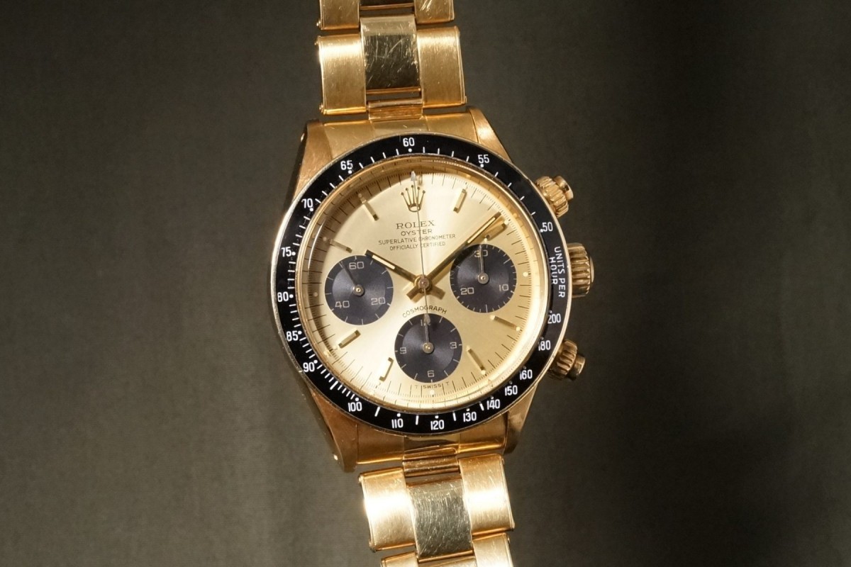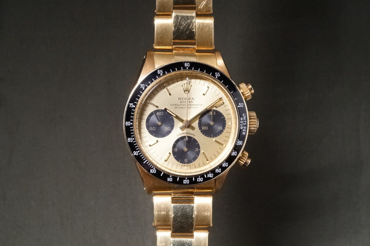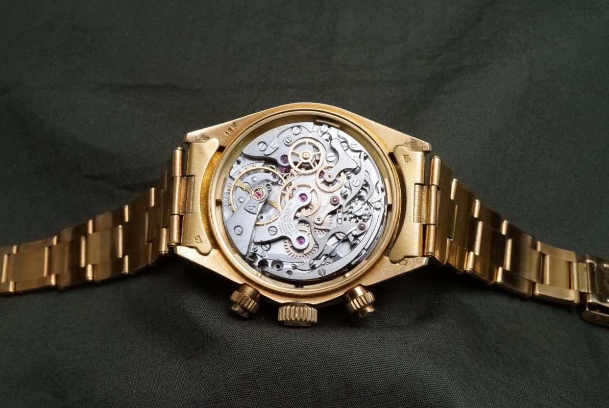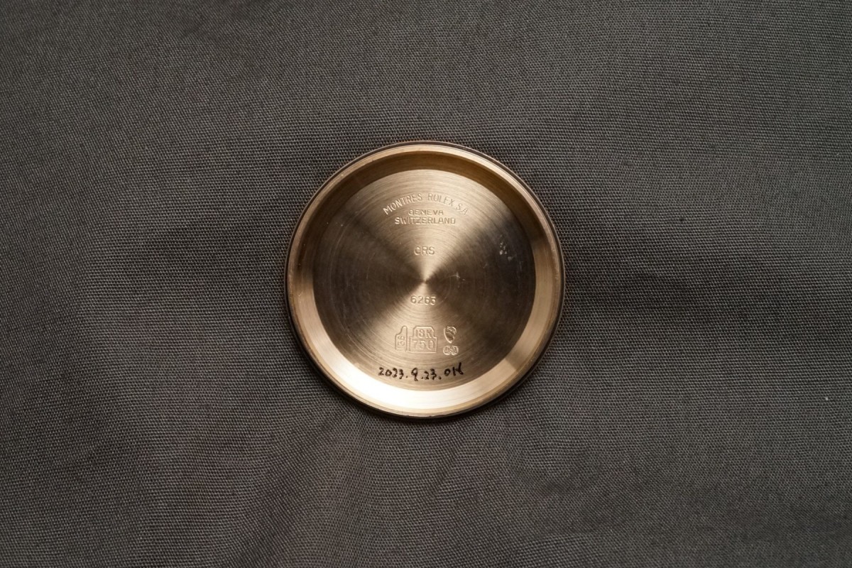 ロレックススポーツにおける最高峰ラインの金無垢デイトナ6263/8のシャンパンダイアルが入荷しました。ダイアルは目立つ荒れや傷等のない、全体を通してとても綺麗で、インダイアルの汚れも見当たらない美しい状態です。また針夜光も含めオールトリチウムです。欠け易いダイアルのドット夜光は一部に変形がありますが、欠け等もなく色味も変色もなくかなり良い状態を保っています。ケースはやわらかい金無垢モデルにありがちな過度の研磨や大きな傷など無く、オリジナルフォルムを残した良好なコンディションを維持しております。数の少ない金無垢モデルでは特に重要なパーツであるプッシャーも当時の溝無しマーク2プッシャーがしっかりと残っています。マーク2ベゼルも全体を通してとても綺麗な状態です。リベットブレスは軽い伸びや小傷はありますが概ね良好な状態です。機械は全巻きの3姿勢時で日差20秒以内に収まる良好な状態です。ゴージャスなゴールドスポーツモデルの中でも間違いなく満足度では群を抜いている存在がこの金無垢デイトナです。ひと昔前のシャンパン系ダイアルはあまり人気はありませんでしたが、近年はイエローゴールドへの評価や人気の高まりから、ここ最近は人気と注目度の高まりが強いモデルです。気になる方は是非ご連絡くださいませ。