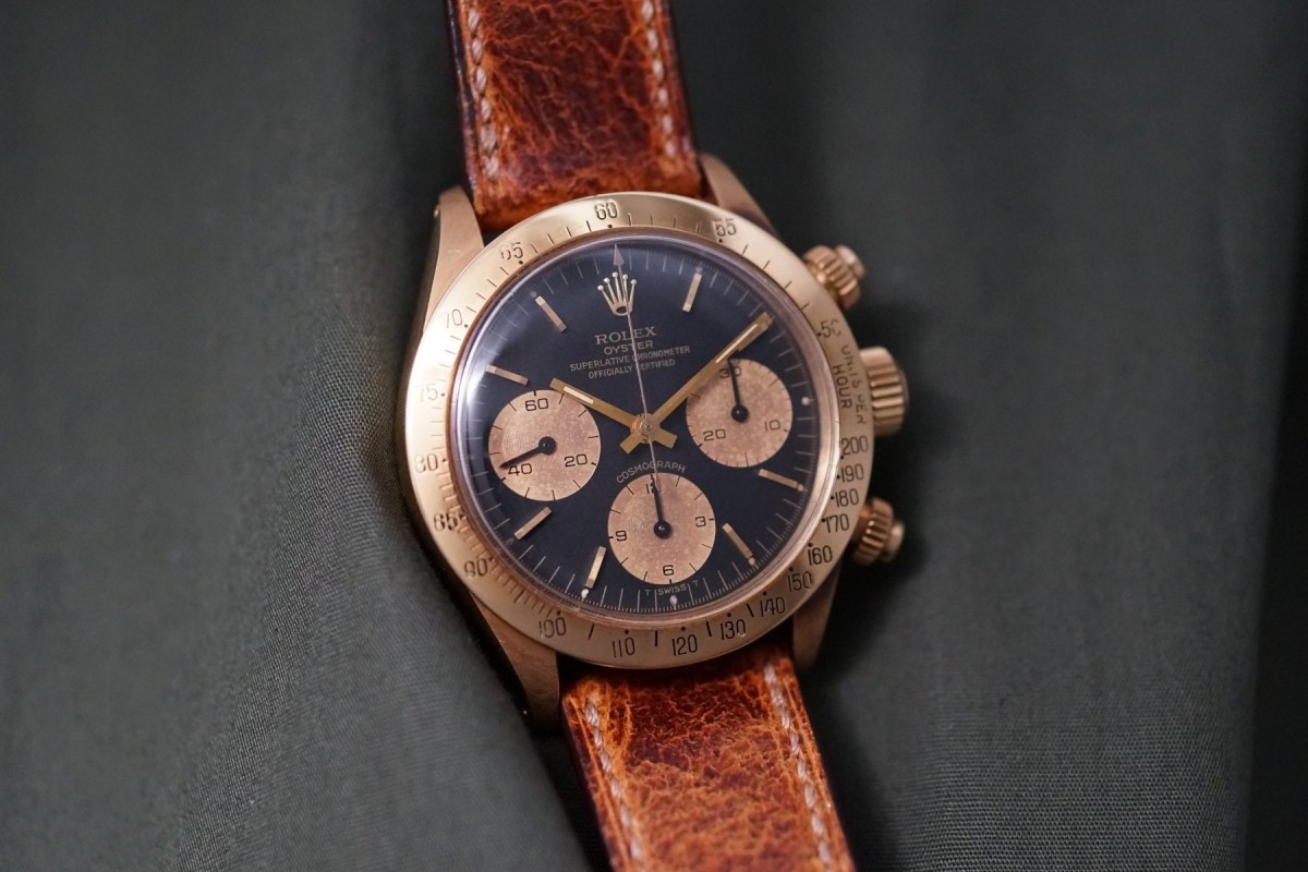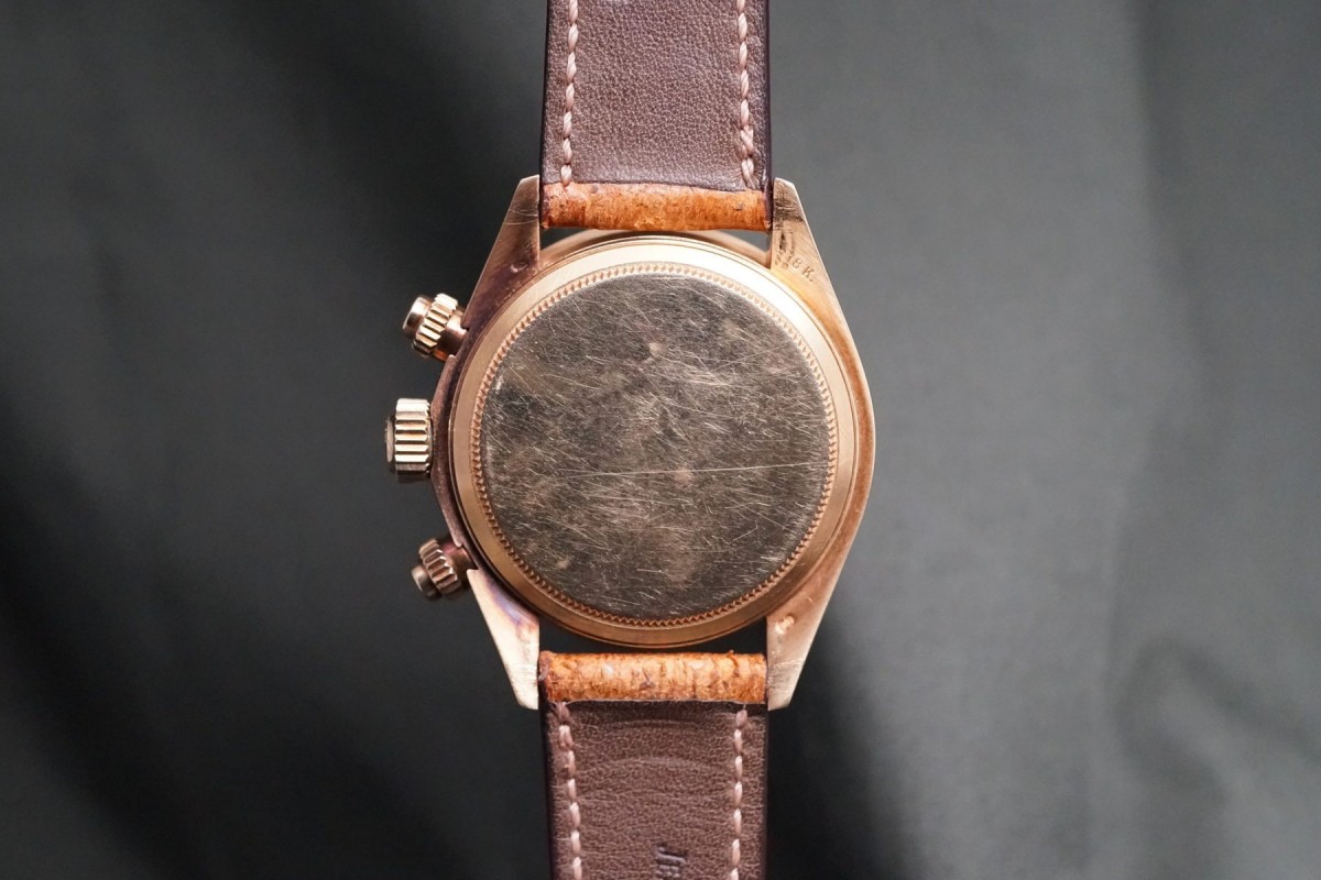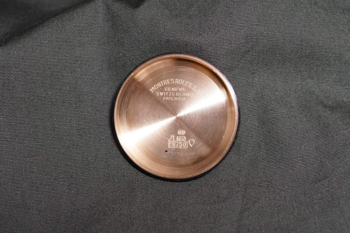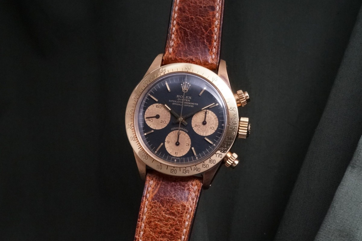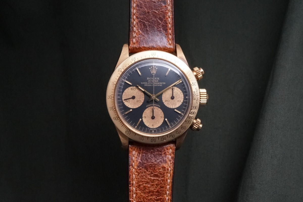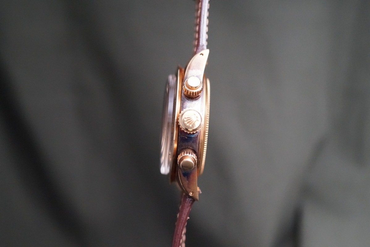 ロレックススポーツにおける最高峰ラインの金無垢デイトナ6265/8ブラックフェイスが入荷しました。ダイアルはインダイアルに経年が見られますが、割と綺麗で大きなムラもなくブラウン調カラーになった渋めのダイアルになっています。ドット夜光は仕方がありませんが欠け等はありますが全欠はございません。ダイアルの肌自体は目立つ傷や汚れ等のない良好な状態です。ケースとベゼルは金無垢モデルにありがちな、磨かれて痩せてしまう事もなく、ダレなどもなくオリジナルフォルムを残した良好な状態で、重要な消耗品パーツであるプッシャーもオリジナルの溝なしのマーク2プッシューが残っています。機械は全巻きの3姿勢時で日差15秒以内に収まる精度です。革ベルトにはJCペランのカーフを付け、尾錠はロレックスのオリジナルの18金無垢尾錠を付けています。ゴージャスなゴールドスポーツモデルの中でも間違い無く満足度では群を抜いている存在がこの金無垢デイトナです。※こちらの商品は通販が出来ません。現物確認をして頂いてからの引渡しにさせて頂きます。詳細等につきましては店頭確認、もしくはお電話にてお問い合わせ下さいませ。出来る限り詳しくご説明させて頂きます。