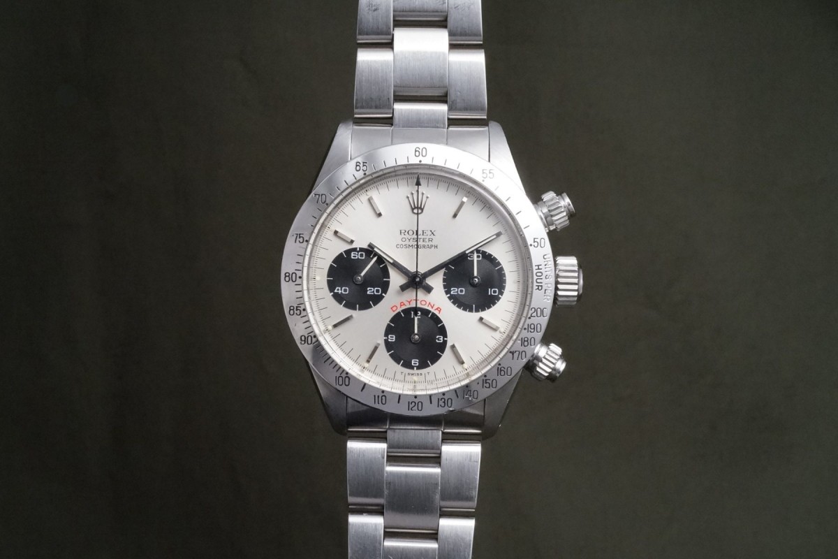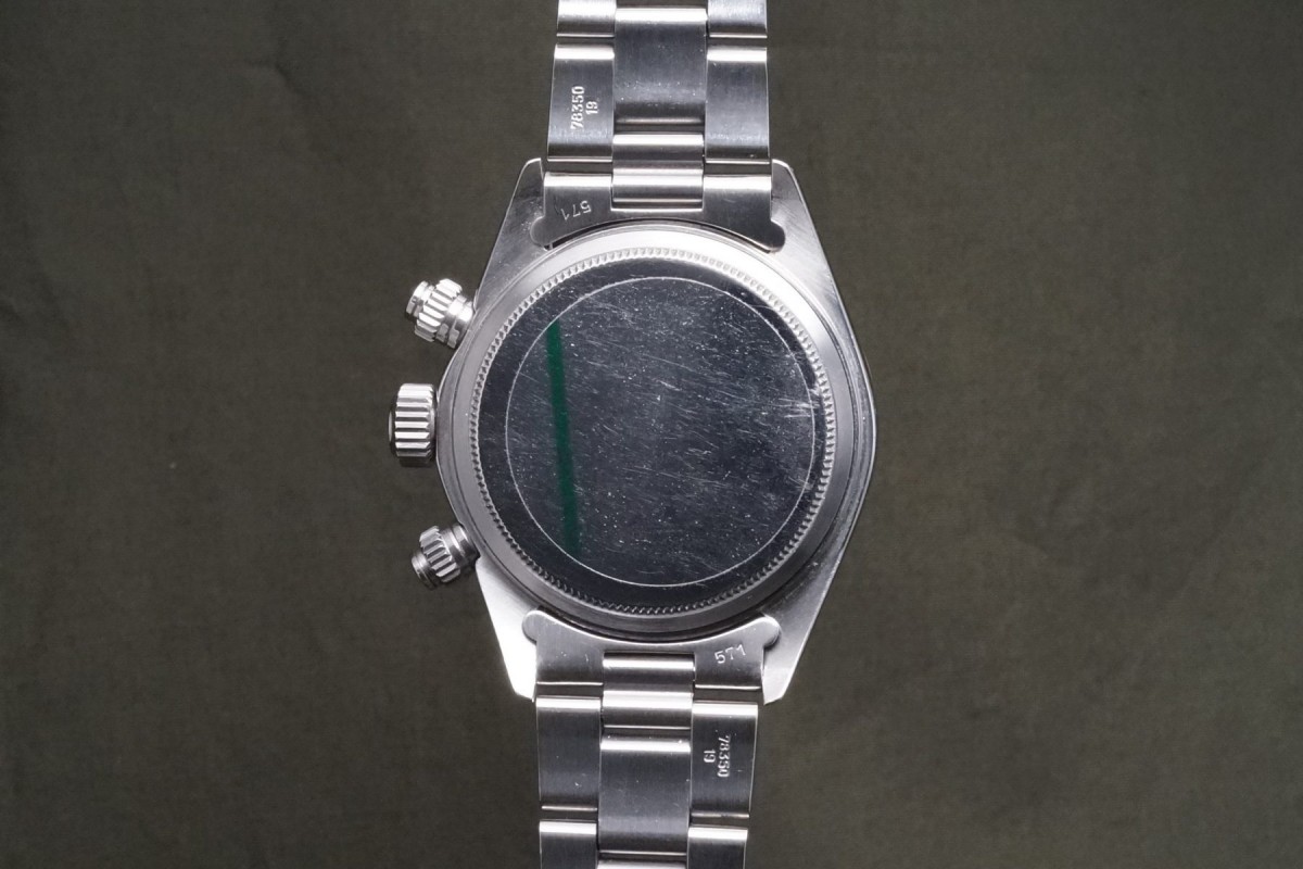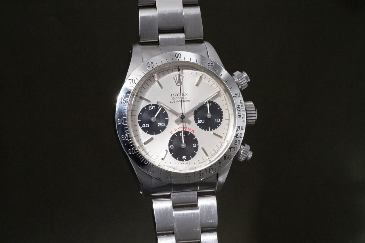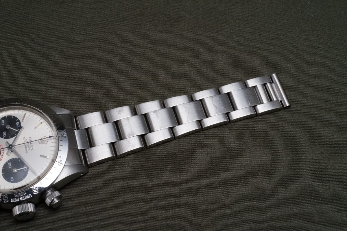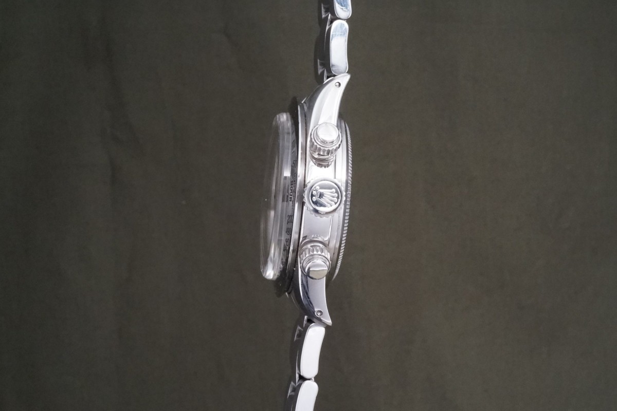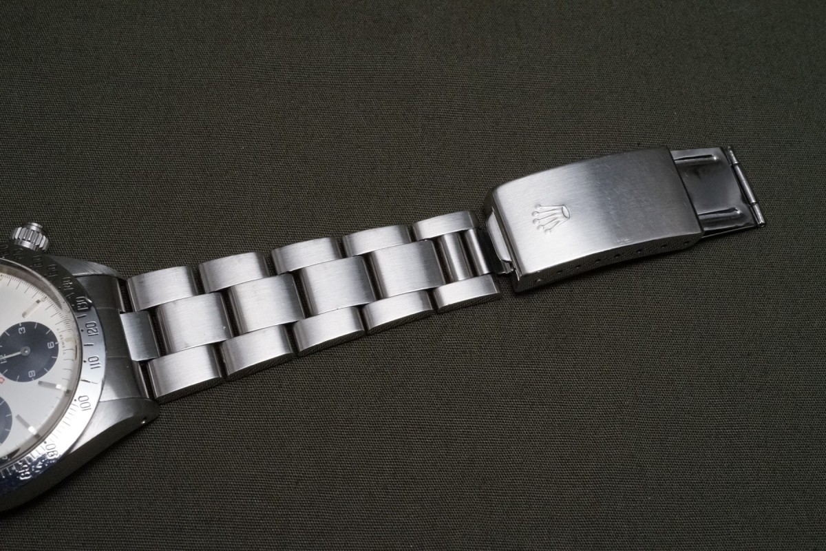 赤BIGデイトナ表記の6265シルバーフェイスが入荷しました。ダイアルの状態は少しだけ経年で軽く薄くアイボリーが入っており、質感的にクリームダイアルに近い感じの、上品さと奇麗さを併せ持つダイアルで、全体を通して大きな傷みや荒れ等の少ない、良い状態を維持しています。ケースは軽く磨かれていますが痩せ過ぎ等はなく、ベゼルもしっかりとした概ね良好な状態です。年式の近いブレスは小傷があり、軽い伸びはございますが概ね良好な状態です。機械は全巻きの3姿勢で日差10秒以内に収まる良好な精度です。個体の評価に影響する肝心な外装パーツであるプッシャーは溝有りに交換され、ダイアルのドット夜光に数か所欠落がございます。以上の事を踏まえ価格は大変お安く出品しているので、内容からはお値打ち感を感じていただける個体かと思います。コスパの高い何かと人気のビッグレッドオイスターデイトナをお探しの方は是非ご連絡くださいませ。