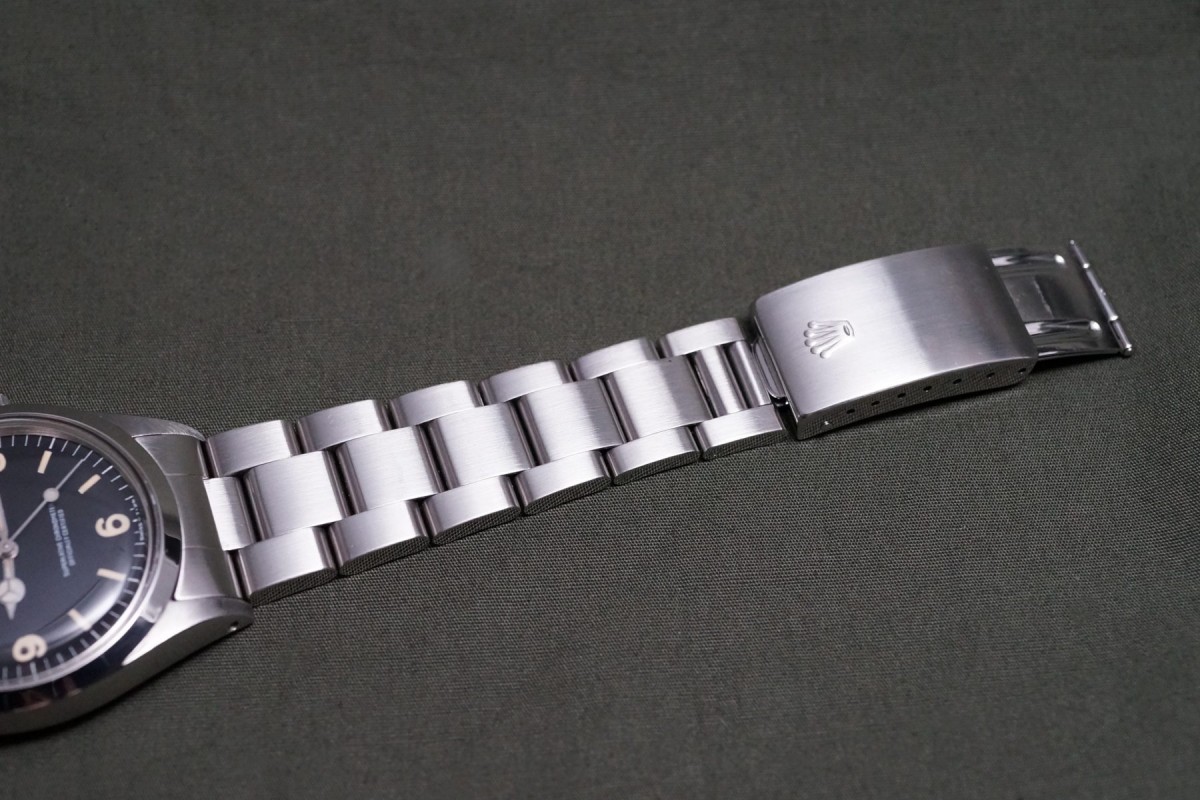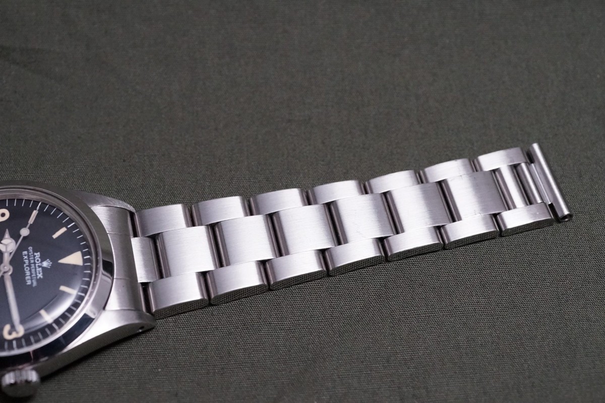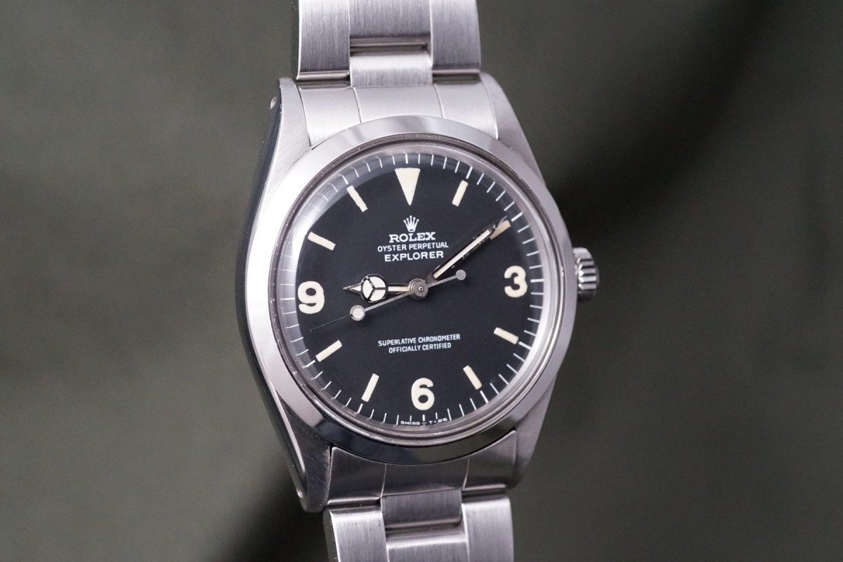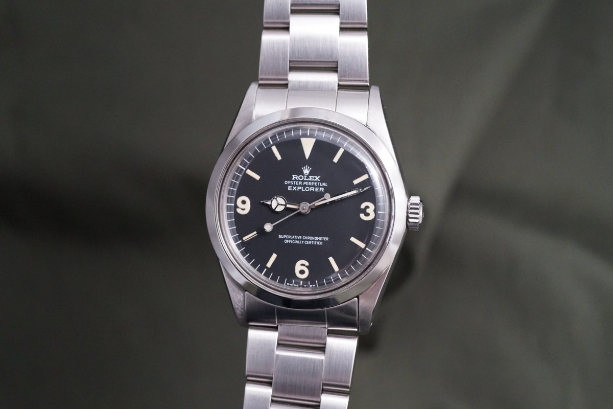 1016マットマーク1ダイアルエクスプローラーが入荷しました。1967年~70年代半ば頃に見られるカエルの手足のようなクラウンが特徴の通称フロッグフットダイアルは愛嬌がある人気のダイアルです。本品はマーク1ダイアルとしては最後年に近い個体のハック付きの後期タイプで、ドット夜光はクリームカラーにイエローカラーが少し入った様なヴィンテージ感のある雰囲気が魅力のダイアルです。状態も目立つ傷み等のない良好な状態です。ケースは勿論ノンポリッシュではありませんが、過度の磨きもなく、ベゼルのエッジを保ち綺麗で良好な状態を維持しています。ブレスも傷や伸び等のない良好な状態です。機械は3姿勢時で日差5秒以内に収まる抜群の精度を出しています。ブレスが後年のハードブレスになっている分、マーク1としては価格は安めにしております。この様なフロッグレッグをお探しの方は是非ご連絡くださいませ。