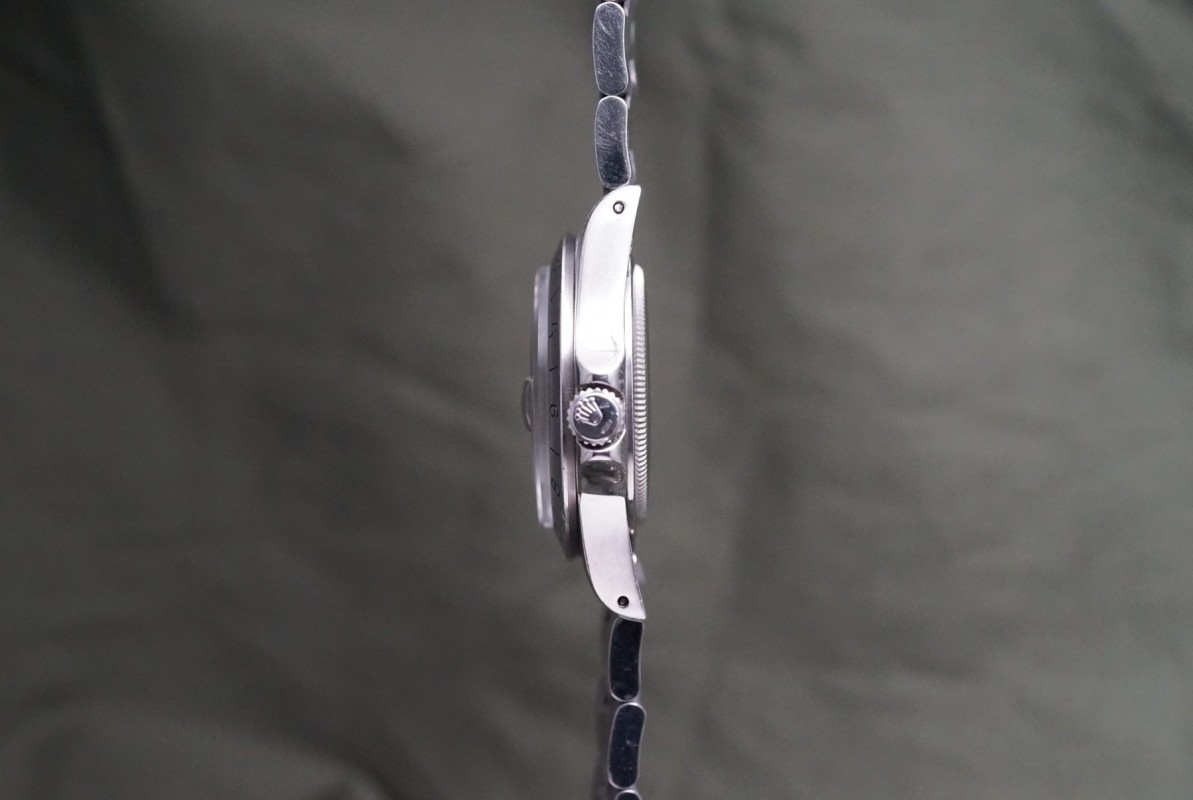 格安特価品の1655エクスプローラーⅡのマーク5ダイアル&4ベゼルモデルが入荷しました。ダイアルはありがちな色褪せや擦れ傷などが見られず、クリームカラーの夜光も欠けなどもない良好な状態で、ダイアルは勿論、4針夜光も全てオリジナルトリチウムです。ケースはラグのエッジに丸みがあり、ややポリッシュ感を感じるかも知れませんが、磨かれ過ぎ等はない状態です。ブレスはスポーツモデル用でない後年のブレスが付いています。状態は軽い伸びと小傷はありますが、全体を通してケースとの一体感があり雰囲気はとても合っています。こちらの機械は販売後にOHをしてからのお渡しになります。ブレス以外のオリジナリティは全てしっかりと整っており、長年使い込まれたロレックススポーツモデルらしい、ツール感と精悍な雰囲気の強い個体で、ガンガン使える実用使いにオススメの1655です。気になる方は是非お問い合わせくださいませ。