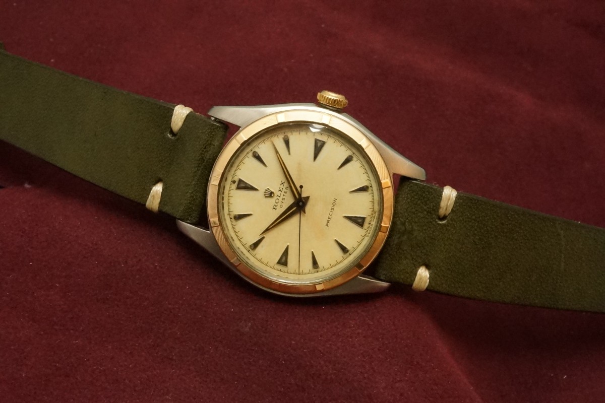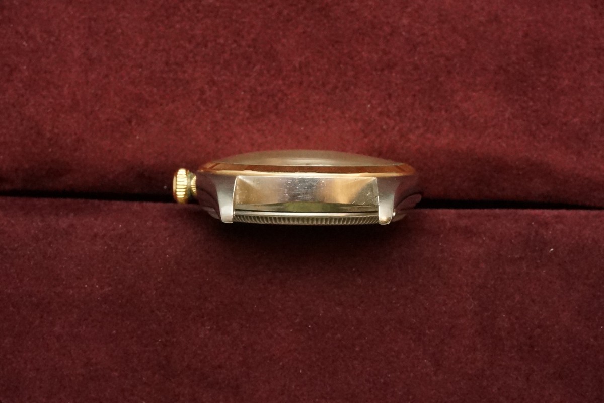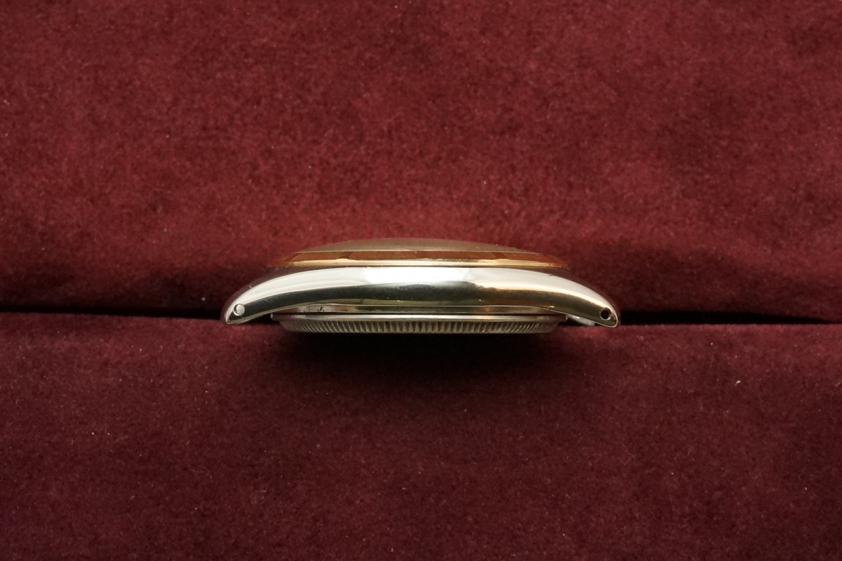 40年代と言えばロレックス3針モデルでは自動巻き機構を備えるバブルバックが全盛の時代でしたが、そのバブルバック後期型により近い50番台のレフを持つこの時代では大変珍しい34mm径薄型ケースの手巻きモデルになります。ダイアルは40年代中頃から多用された楔形アップライトインデックスの中にラジウム夜光を配したロレックス特有のデザインでパウダーホワイトの肌も程良く枯れており、この頃ならではの上品な雰囲気とヴィンテージらしさを味わえます。ピンクゴールド素材に傾斜をかけたオーバル型エンジンターンドベゼルは細かい刻みも鮮明に映えエッジも立ちかなりシャキッとしています。ケースのラグも太く当時のスイスマーク入りリューズも残った抜群の状態です。機械も全巻きで3姿勢時差15秒以内に収まる良好な精度を出しています。コンビモデルにありがちないやらしさを全く感じないバランスの良いデザインと雰囲気の可愛らしい時計です。