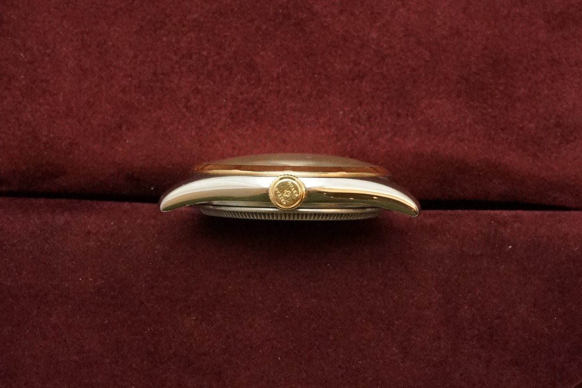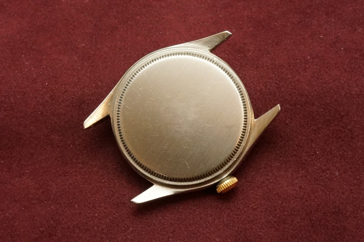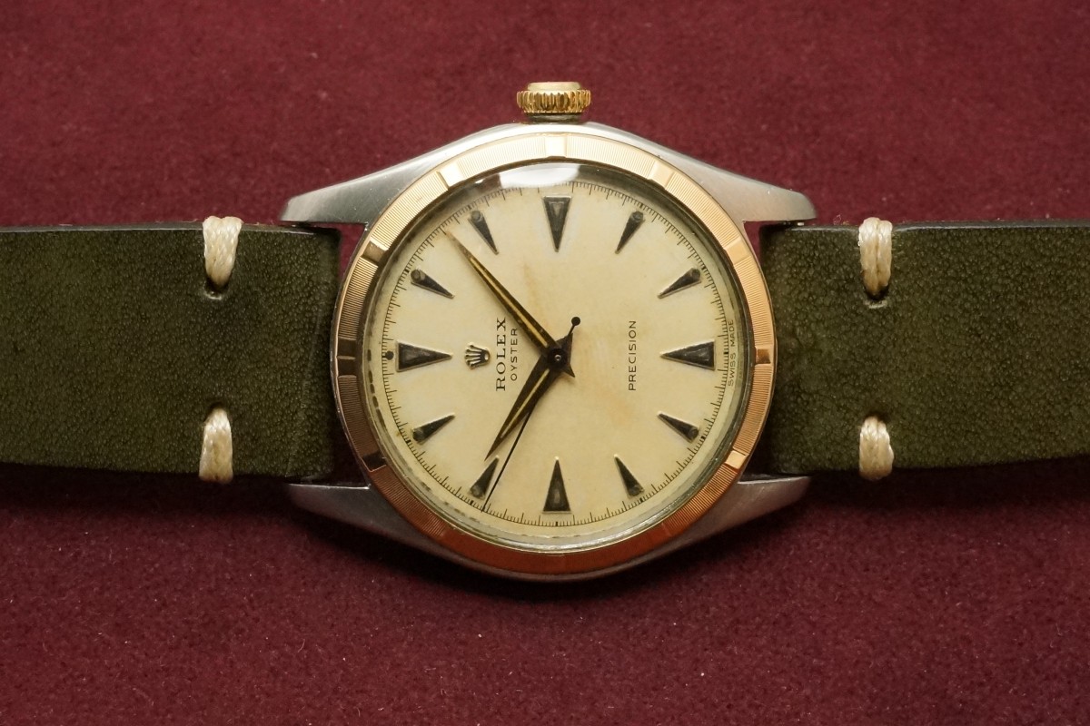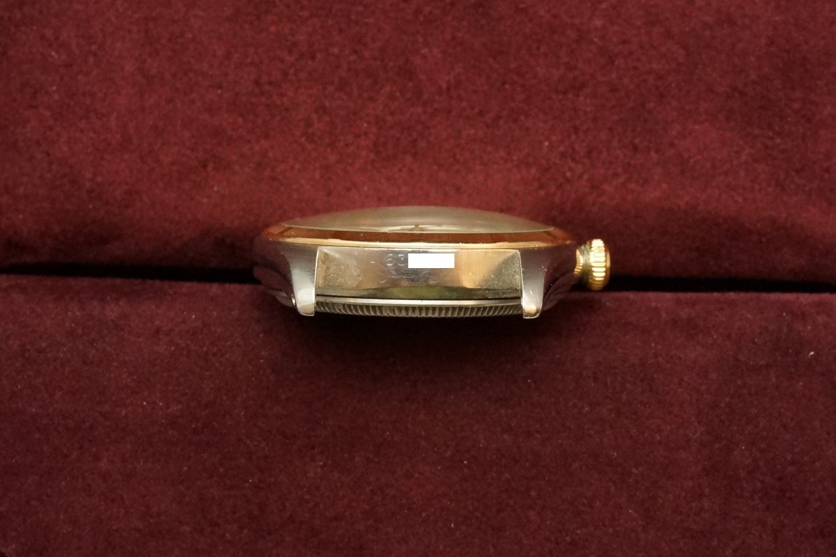 40年代と言えばロレックス3針モデルでは自動巻き機構を備えるバブルバックが全盛の時代でしたが、そのバブルバック後期型により近い50番台のレフを持つこの時代では大変珍しい34mm径薄型ケースの手巻きモデルになります。ダイアルは40年代中頃から多用された楔形アップライトインデックスの中にラジウム夜光を配したロレックス特有のデザインでパウダーホワイトの肌も程良く枯れており、この頃ならではの上品な雰囲気とヴィンテージらしさを味わえます。ピンクゴールド素材に傾斜をかけたオーバル型エンジンターンドベゼルは細かい刻みも鮮明に映えエッジも立ちかなりシャキッとしています。ケースのラグも太く当時のスイスマーク入りリューズも残った抜群の状態です。機械も全巻きで3姿勢時差15秒以内に収まる良好な精度を出しています。コンビモデルにありがちないやらしさを全く感じないバランスの良いデザインと雰囲気の可愛らしい時計です。