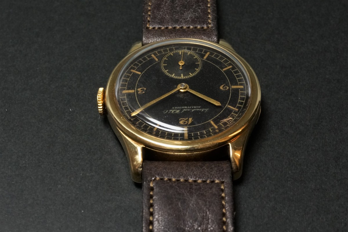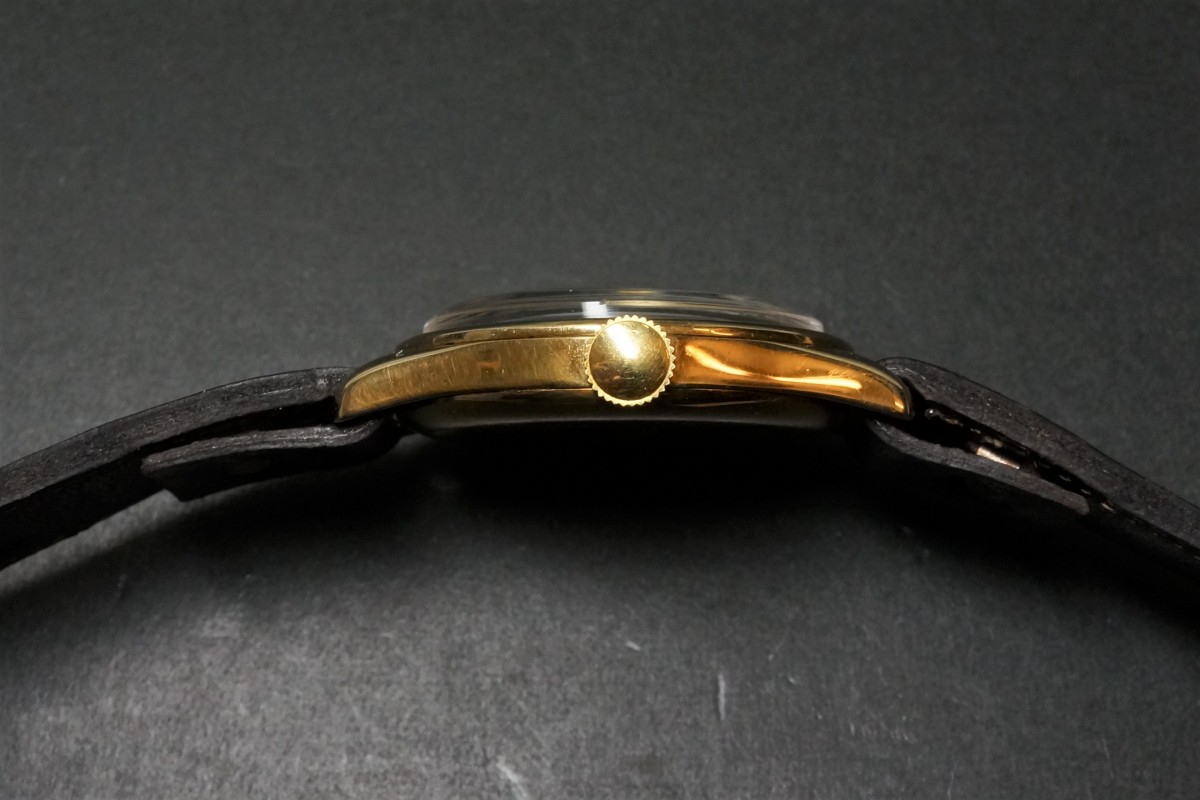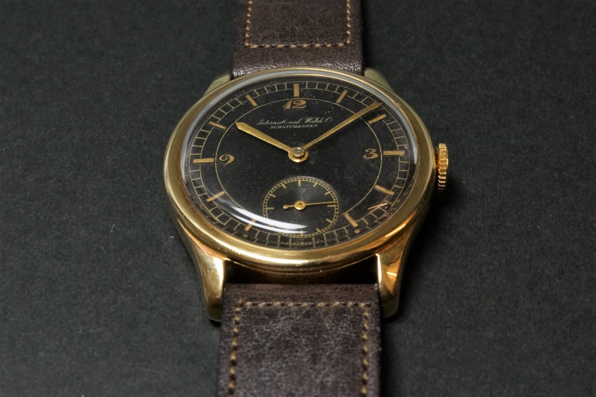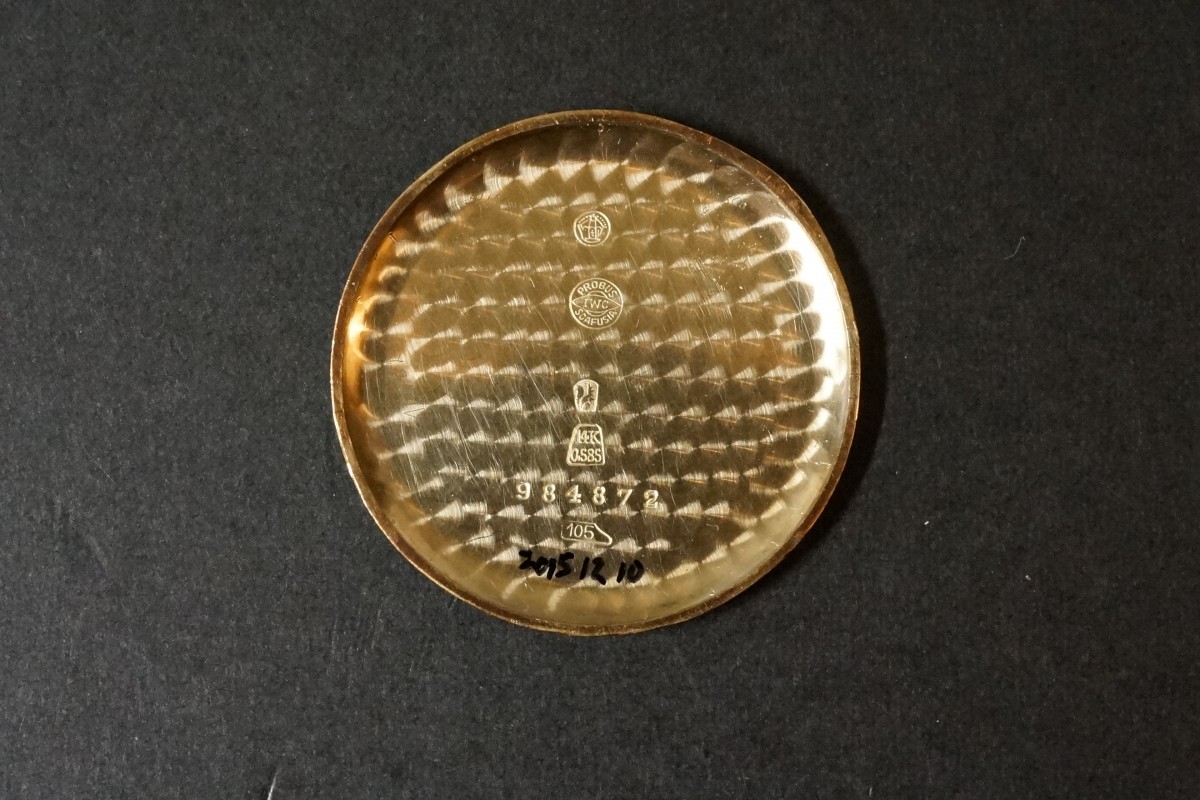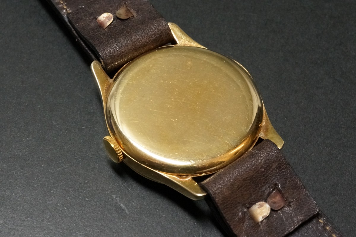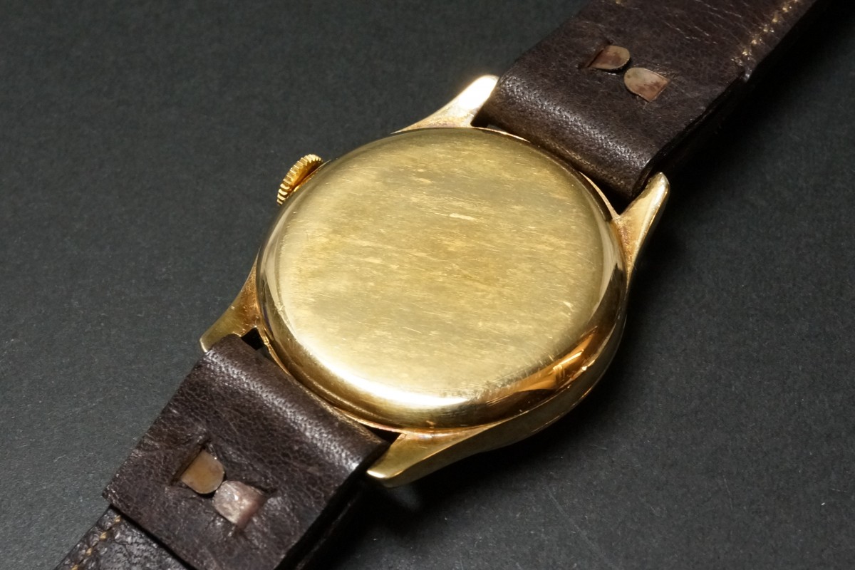 ケースは64T等でも見られる珍しいベロ防水の様に裏蓋に一部が飛び出て、開閉しやすい構造のケースから、ここからも古めかしい懐中時計からの流れを感じる造りの凝ったカラトラバケースケースです。過去にポリッシュが掛けられ少し丸みはありますが傷が付きやすく、磨かれてしまう事が多い金無垢ケースでしかも最初期モデルとしてはかなり良い状態を保っています。インターの特徴の剣型長短針、防水ケースとは違った繊細でケースとぴったりとマッチしたオリジナルクラウンも残ったオリジナリティーの高さもあります。