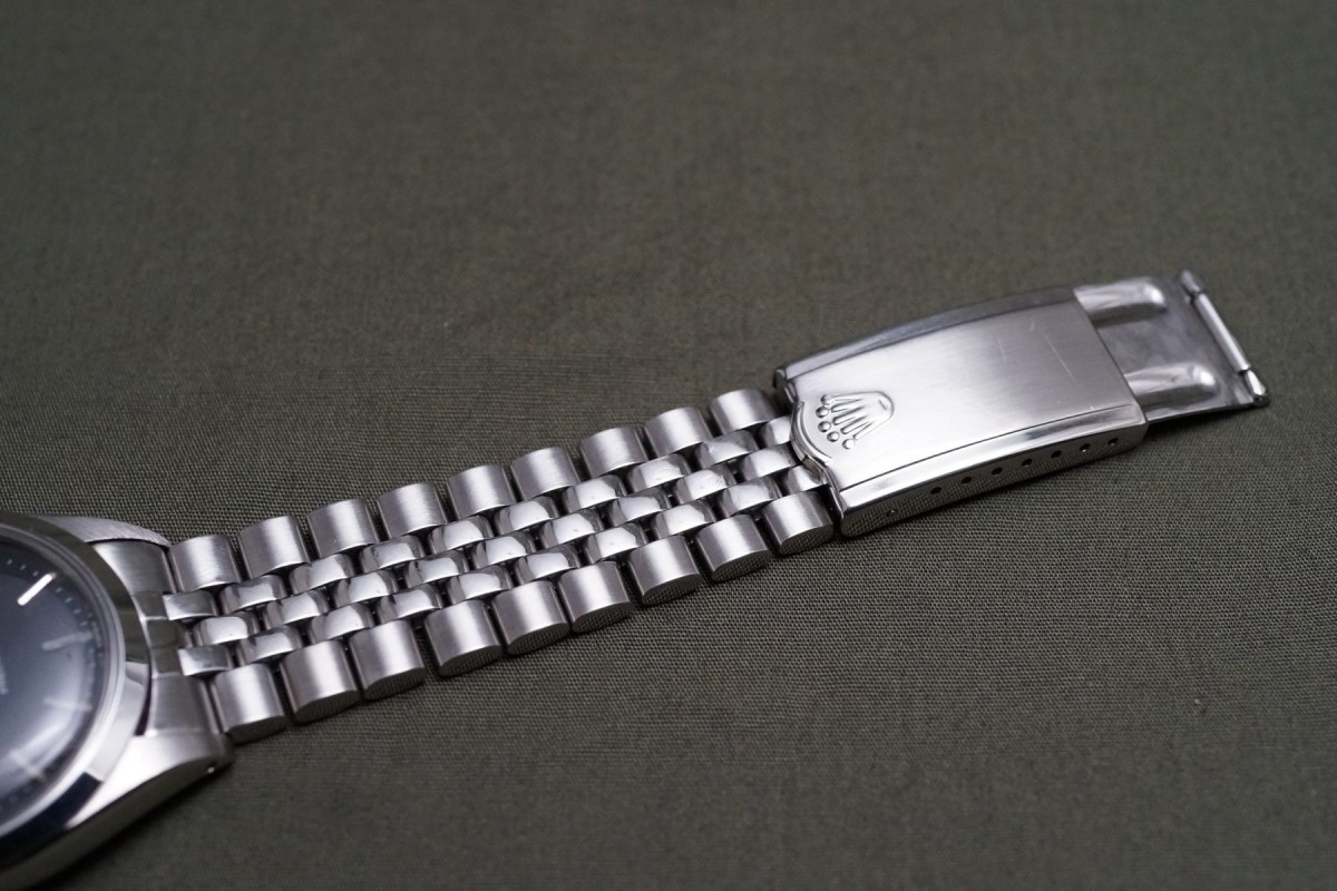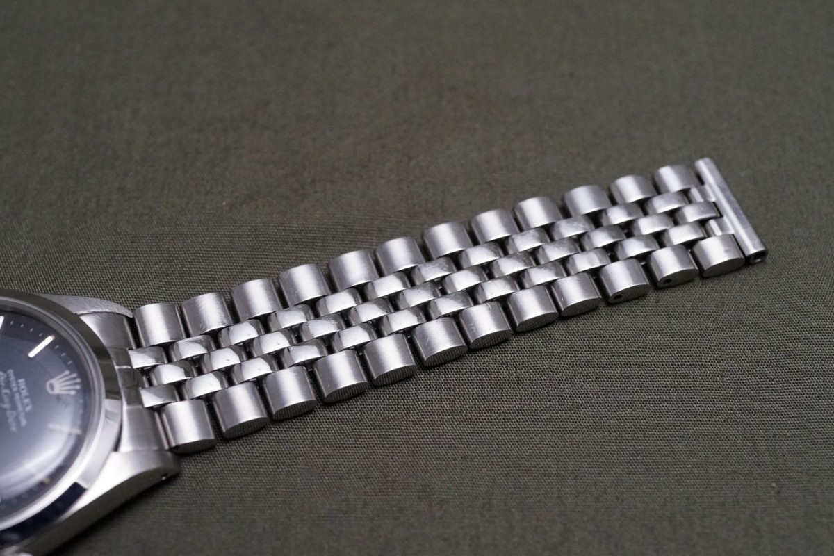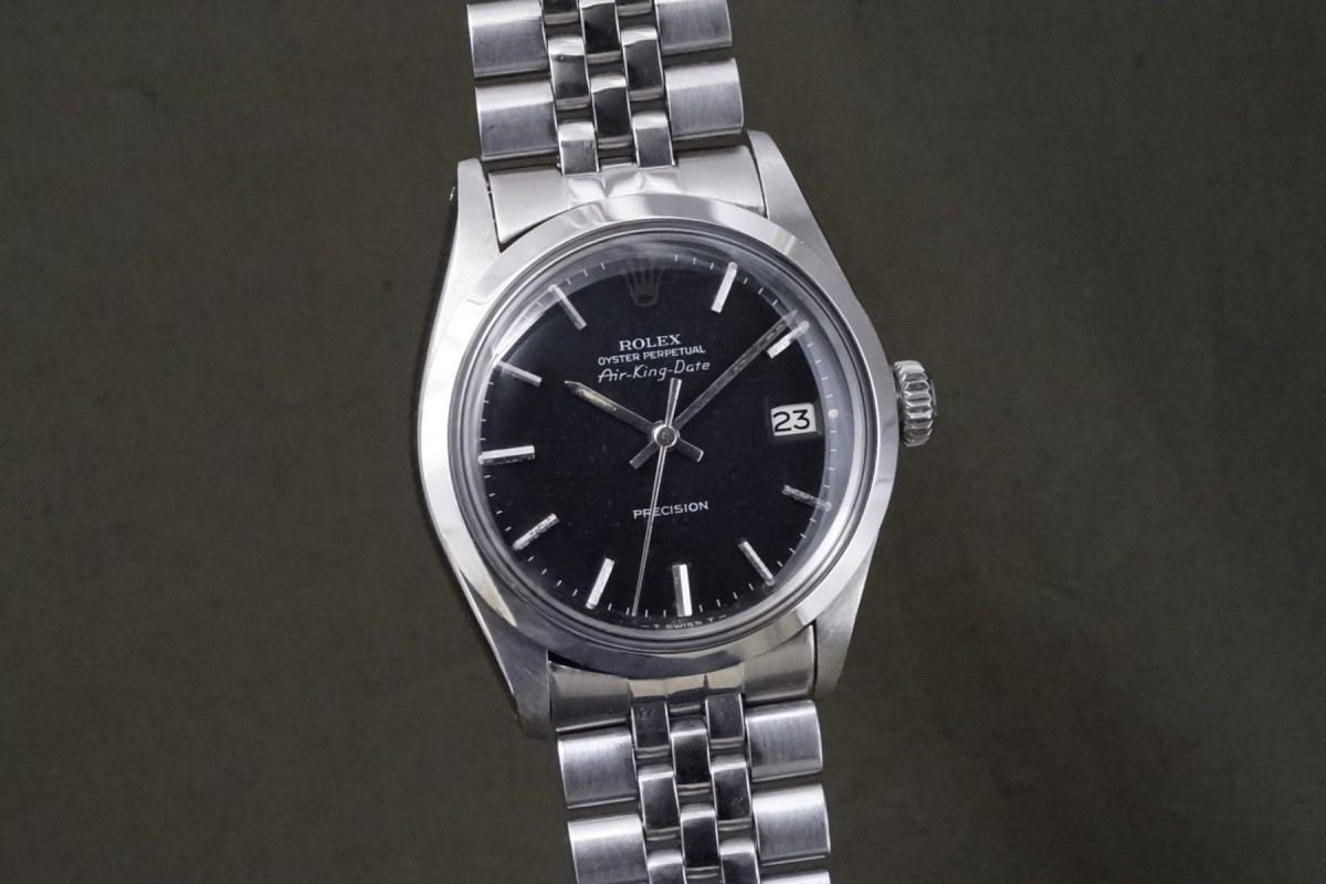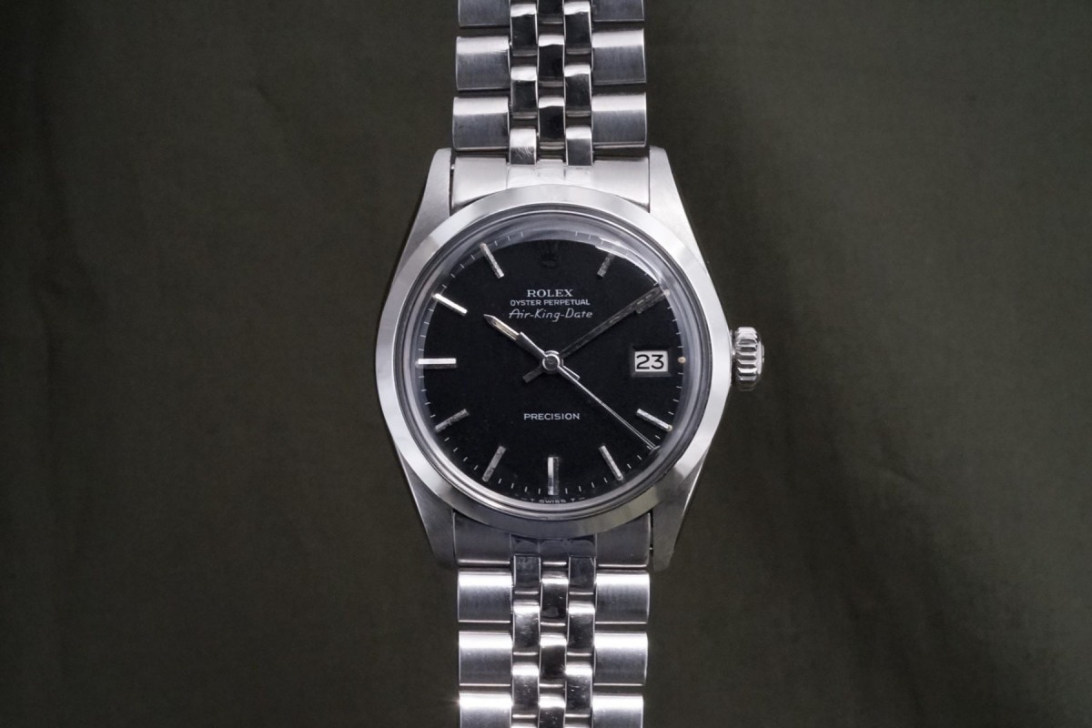 レアモデルのエアキングデイトの中でも、更に希少度の高いブラックダイアルが入荷しました。デイト無しノンクロノメーターのスムースベゼルモデルがエアキングになりますが、本品はビッグエアキングと同様の亜流バージョンの数の少ないモデルです。状態は多少の経年はございますが、ブラックダイアルがヤレや傷みを吸収するので裸眼では、気になるほどではない決して悪くない状態です。また針夜光も含めオールトリチウムです。ケースはふっくらとしたフォルムを保った良好な状態です。機械は3姿勢時で日差15秒以内に収まる精度です。FF49のUSジュビリーブレスはデイトナに流用できる人気のブレスで、このブレス単体だけでもそれなりの価格で取り引きされていますので、トータルコストではお値打ち感を感じていただけるかと思います。実用使いにも、人と被ることのまずないレア度の高い個体をお探しの方にオススメのエアキングデイトです。