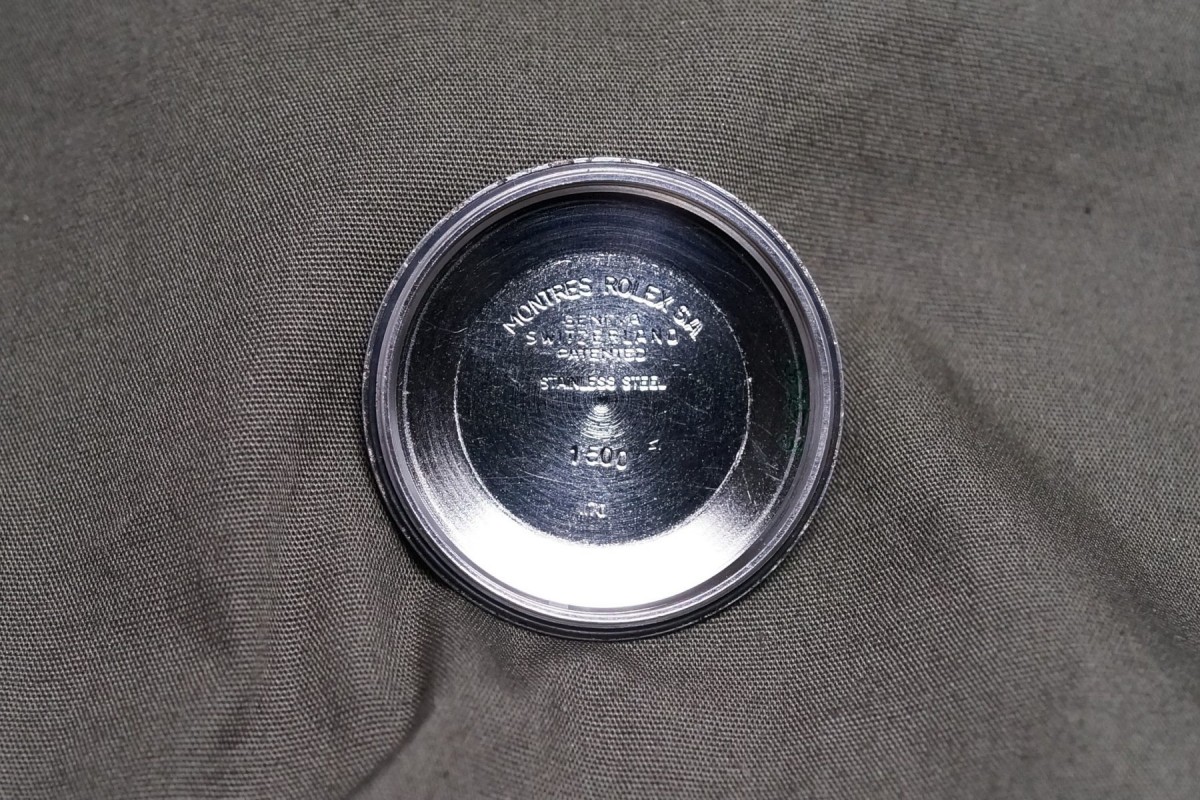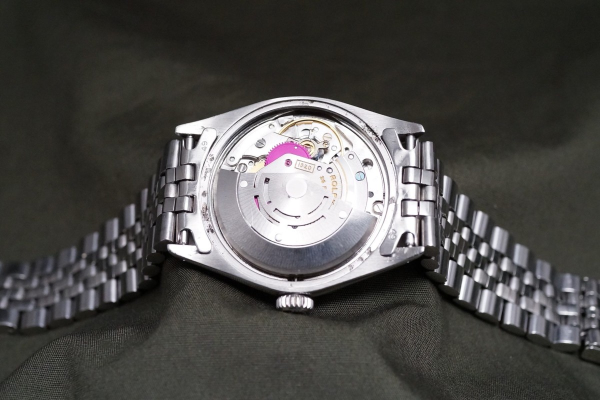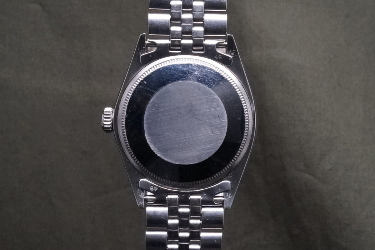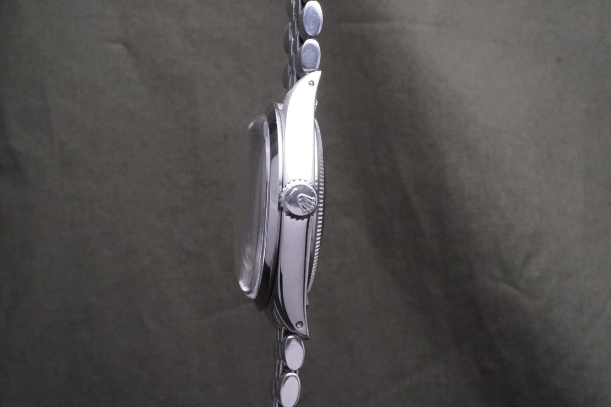 レアモデルのエアキングデイトの中でも、更に希少度の高いブラックダイアルが入荷しました。デイト無しノンクロノメーターのスムースベゼルモデルがエアキングになりますが、本品はビッグエアキングと同様の亜流バージョンの数の少ないモデルです。状態は多少の経年はございますが、ブラックダイアルがヤレや傷みを吸収するので裸眼では、気になるほどではない決して悪くない状態です。また針夜光も含めオールトリチウムです。ケースはふっくらとしたフォルムを保った良好な状態です。機械は3姿勢時で日差15秒以内に収まる精度です。FF49のUSジュビリーブレスはデイトナに流用できる人気のブレスで、このブレス単体だけでもそれなりの価格で取り引きされていますので、トータルコストではお値打ち感を感じていただけるかと思います。実用使いにも、人と被ることのまずないレア度の高い個体をお探しの方にオススメのエアキングデイトです。