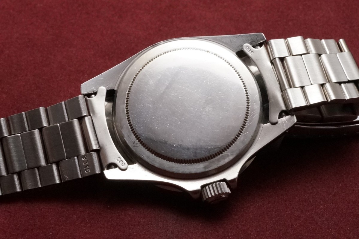 雰囲気の良い赤サブマリーナーマーク4が入荷しました。画像では中々伝わりにくいかも知れませんが、夜光はパンプキンカラーに色濃く綺麗に灼けており、肌のブラックカラーも保ったヴィンテージ感抜群のダイアルです。状態も目視で分かる傷みや荒れがなく、夜光の欠け等もない良い状態です。ケースも磨かれ過ぎや大きな傷等のない良好な状態で、年代のバッチリと合うブレスもとても綺麗で伸びの少ないかなり良い状態を維持しています。マーク3ベゼルも少し赤茶けた様な独特な色味で、パティナダイアルに非常に良く似合う一体感のあるインサートを装着しています。こちらの機械は販売後にOHをしてからのお渡しになります。とにかく灼けが強く、かつ状態も整えたダイアルをお探しの方にオススメの赤サブです。