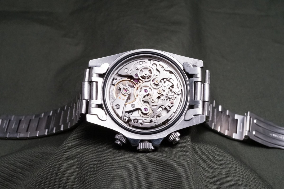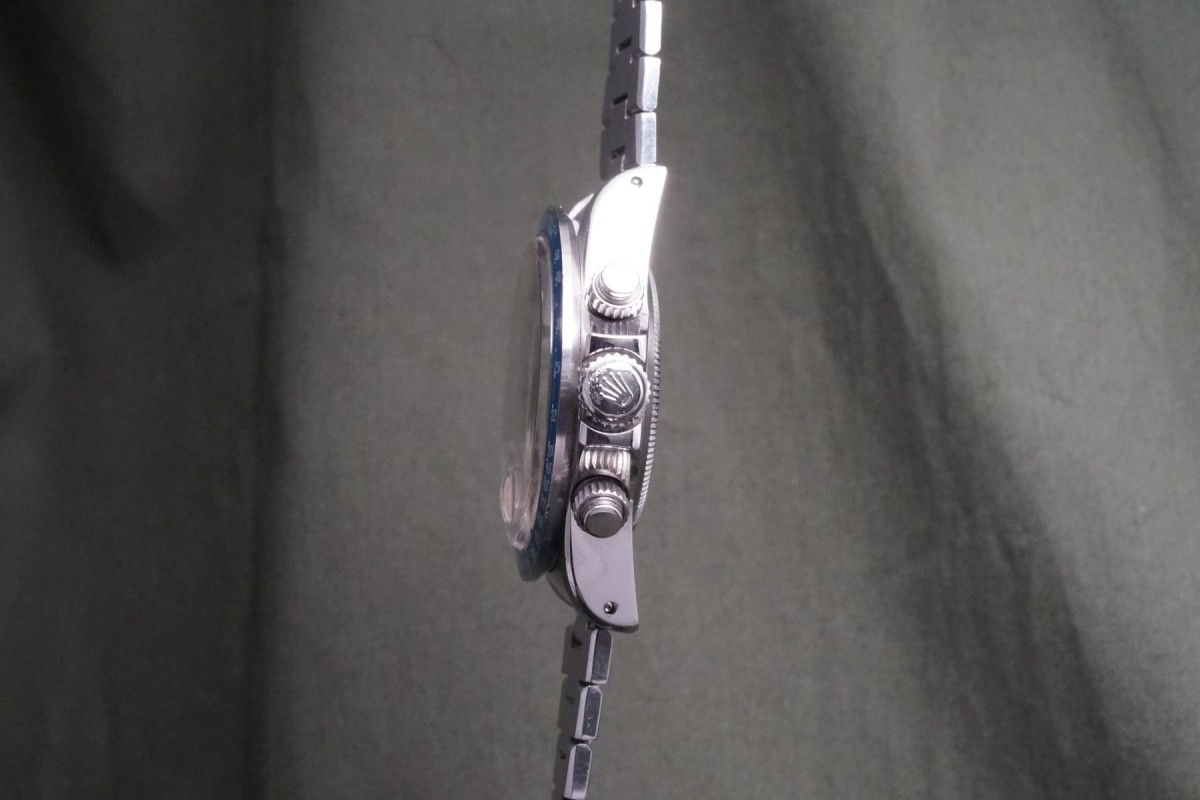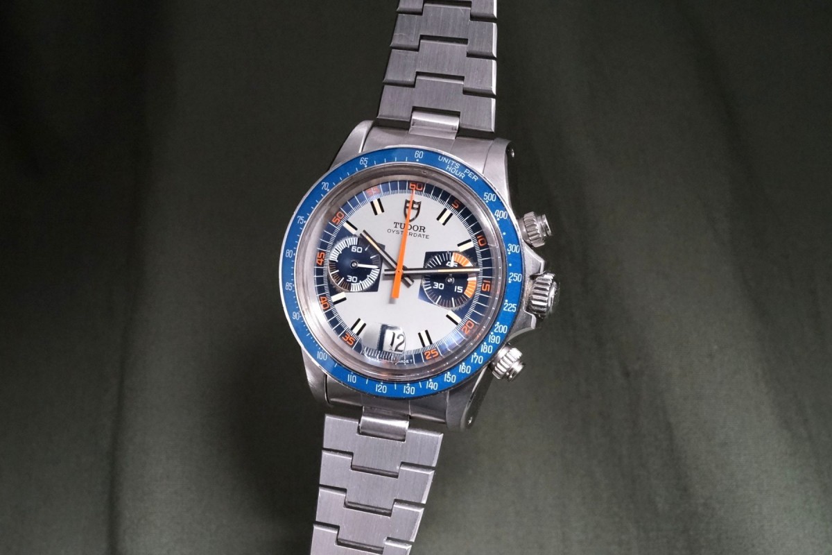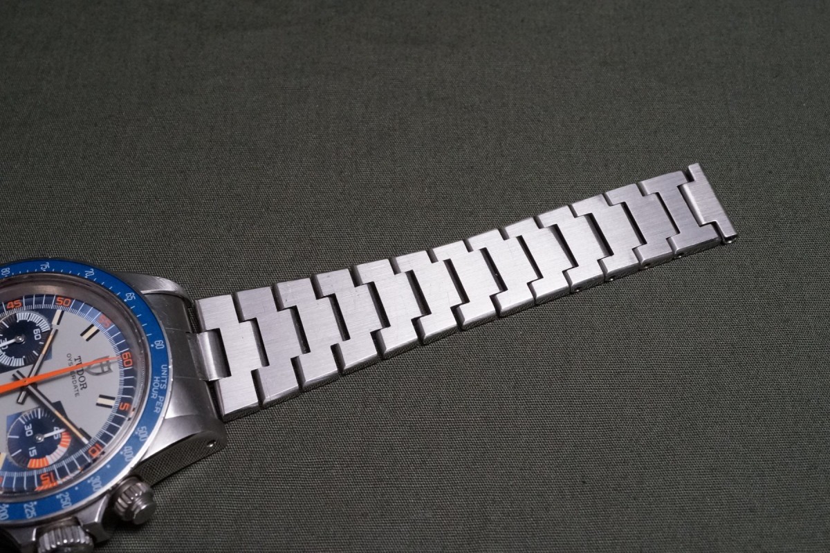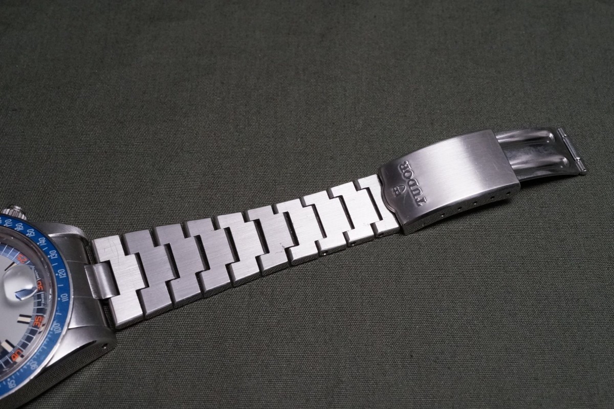 チュードル2レジスターモンテカルロのブループラスチックベゼルモデルが貴重なジャパンブレス付きで入荷しました。本品は先代ファーストのホームベース・モンテカルロからは第二世代にあたるセカンド・モンテカルロになり、このモデルから登場するブルーダイアル&ブルーベゼルがまさにチュードルらしいカラーリングで大人気となっています。ダイアルは、ブルー部分によく表れる経年がインダイアル周りに少し見られますが、あまり目立つものではなく、その他は綺麗で夜光欠落も無い概ね良い状態を維持しています。交換されやすいクロノ針・時分針は勿論当時のままで、インダイアルの小針も2本共に太い仕様のオリジナルが付いています。肝心なプラスチックベゼルも大きな打ち傷やプラ部分に浮きが無く、ケースもシェイプをしっかりと残す良好な状態です。機械も3姿勢時差で日差10秒以内に収まる精度を出しています。プッシャーが交換されている以外は大きなマイナスポイントの無いお値打ちな個体となります。ジャパンブレス付きでお探しの方に是非、実物を見て頂きたいと思います。