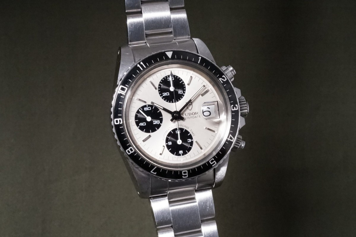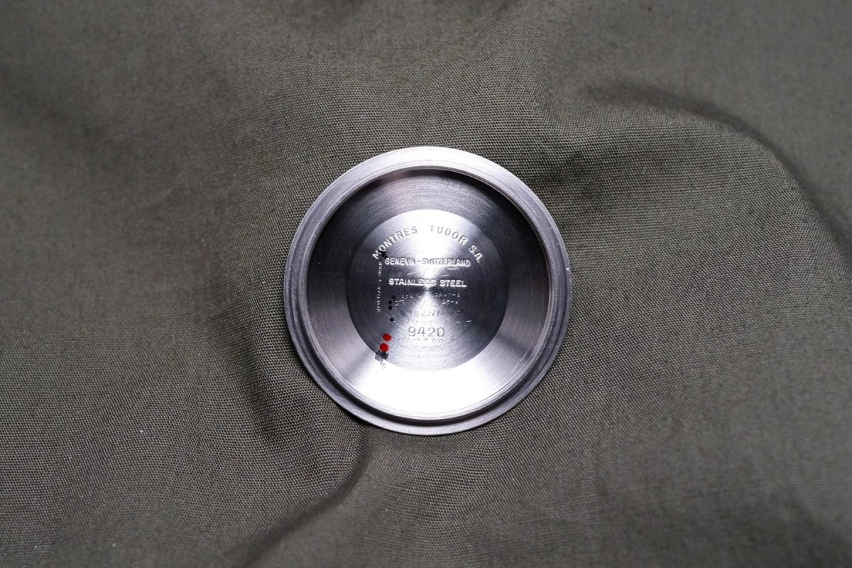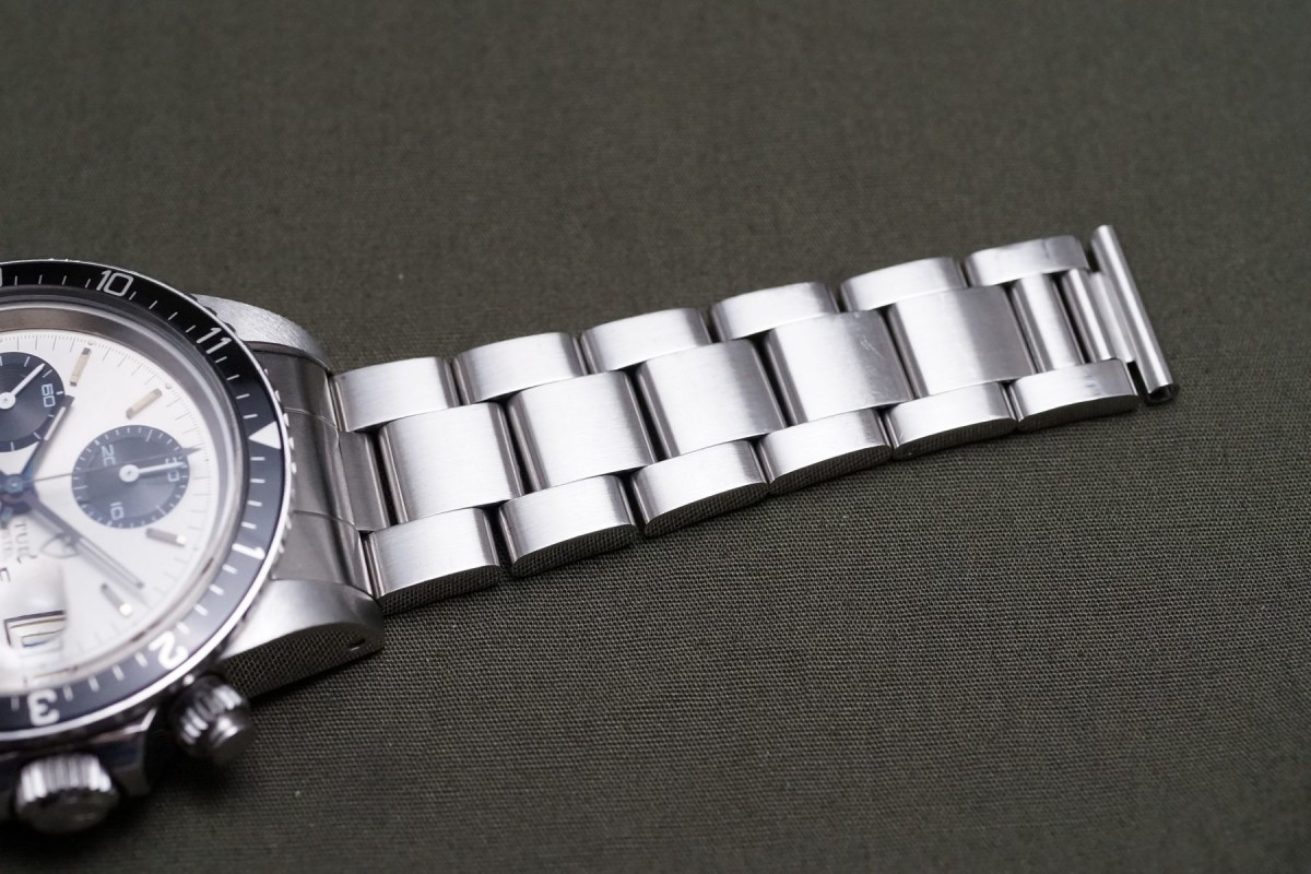 ビックブロック・セカンドクロノタイムの前期79170シルバーフェイス&回転ベゼル仕様が入荷しました。本品はレフ番が791..からの所謂カマボコケースのクロノタイムで、チュードルのみ展開された回転ベゼル使用のモデルとなります。ダイアルは前期の特徴である『T SWISS T』表記とデイトカレンダーに枠があり、台形型のアップライトインデックスがセットされています。また、肝心な回転ベゼルも交換用ではないオリジナルが残った個体です。ダイアルは非常に綺麗でドット夜光の欠落も無く、長短針にもオリジナルのトリチウム夜光がしっかりと残ります。打ち傷が入りやすいベゼルも目立つ傷等は無く、無骨で迫力のあるカマボコケースは小傷は見られるもののラグは太く、長くどっしりとしています。年代のばっちり合うカマボコケース専用のFF589が付いたチュードルブレスは若干の伸びと小傷がある程度の状態です。機械は3姿勢時差で日差15秒以内に収まる良好な精度を出しています。チュードルにしかない回転ベゼルの無骨なクロノタイムは如何でしょうか。